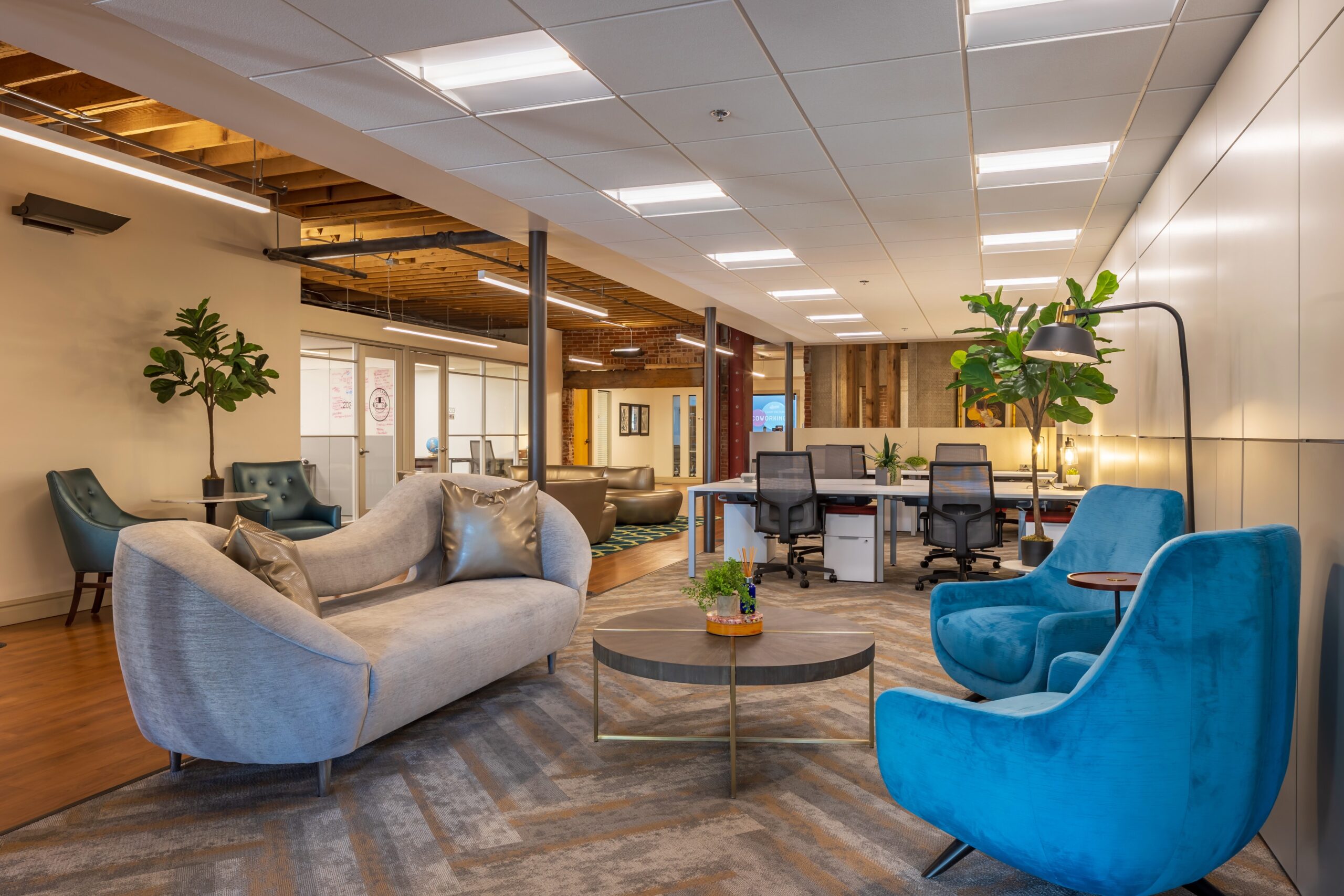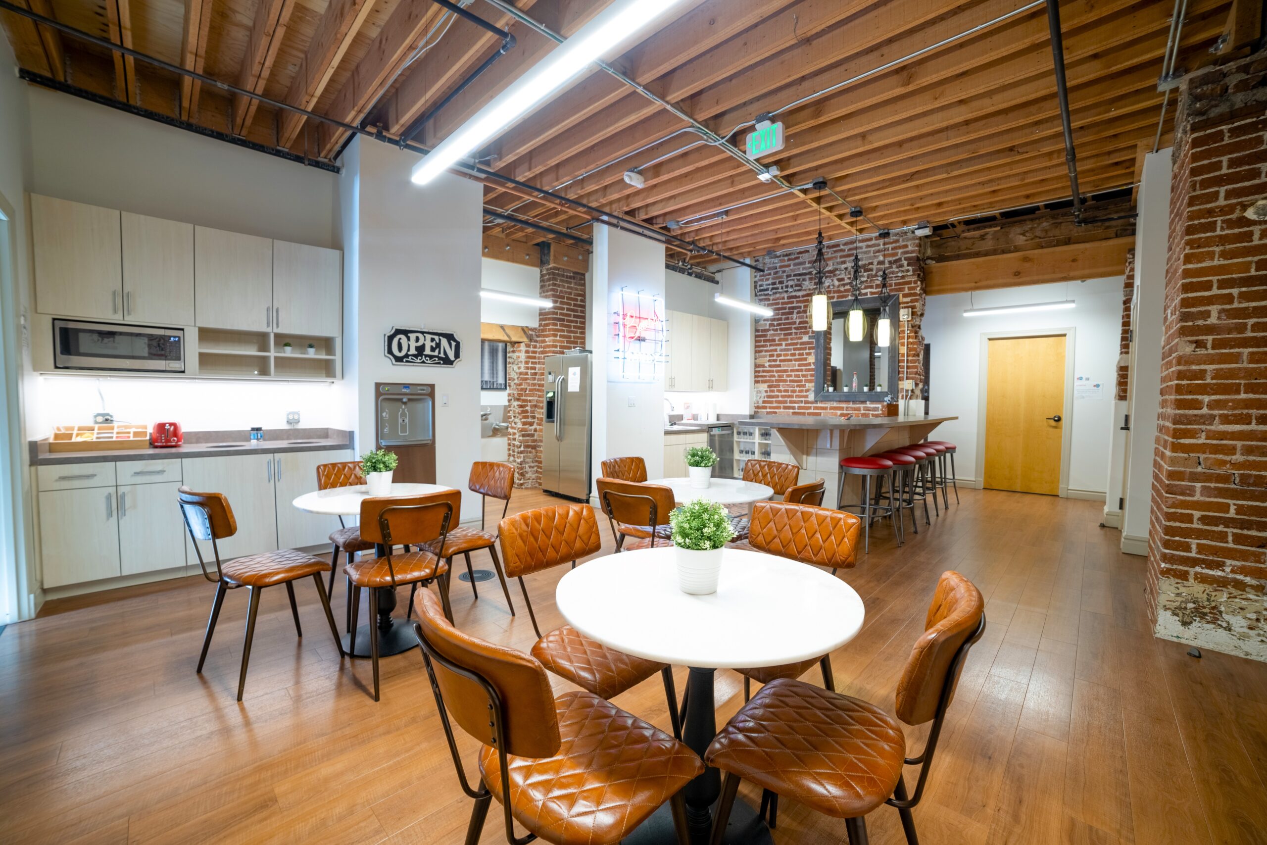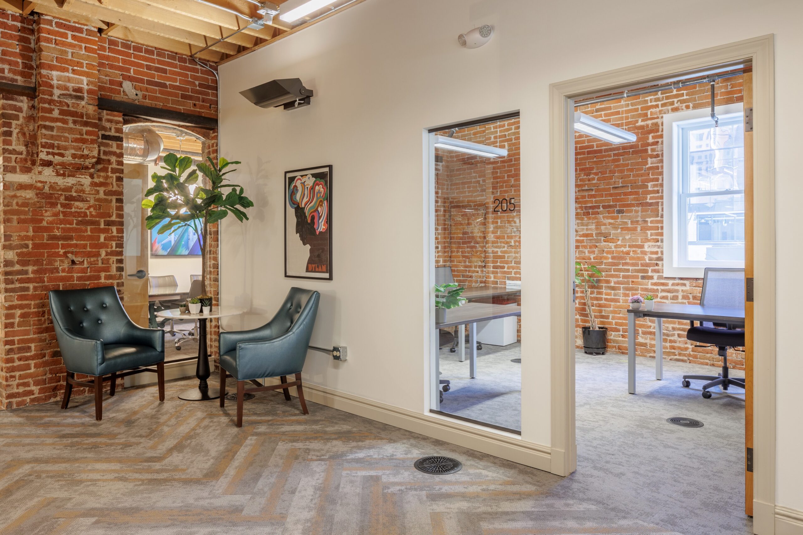 Our featured space is the only corner and largest private office, totaling 192 SF, and fits up to 5 people. The space offers plenty of natural light, a great view, original brick, and wood beam ceilings. Contact us to take a tour!